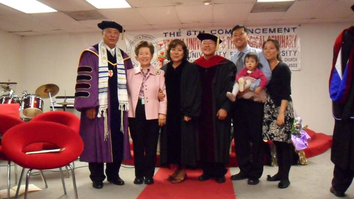 현 베드로 총장 현 에스더 이사장 윤에스더 박사 윤건상 학장 및 아들박사내외 손녀
